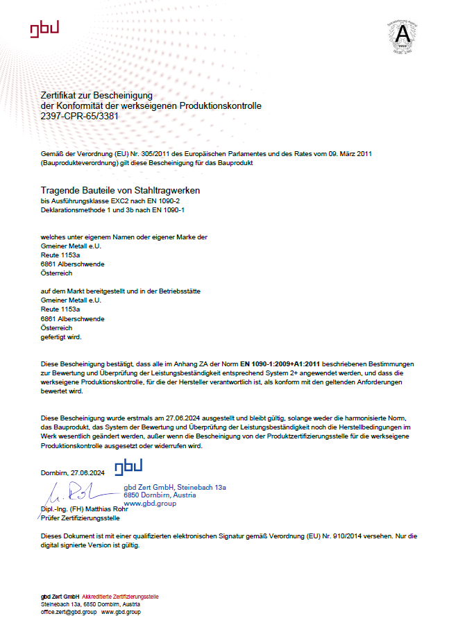 Wie es gesetzlich gefordert ist sind wir nach EN 1090 für Stahltragwerke zertifiziert.